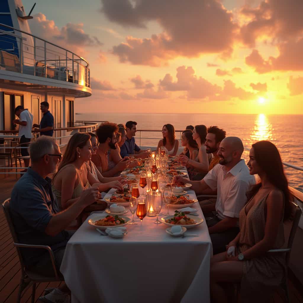 Jantar a bordo de um navio de cruzeiro pode ser um grande acontecimento, especialmente para grupos. Programas especiais de jantar em grupo garantem que todos possam desfrutar da refeição juntos. Seja um jantar temático celebrando uma culinária específica ou uma noite de gala formal, as operadoras de cruzeiros se esforçam para criar um ambiente gastronômico que combine com os desejos do grupo. Experiências gastronômicas exclusivas costumam ser complementadas com descontos para grupos ou experiências culinárias sofisticadas gratuitas em restaurantes especializados.